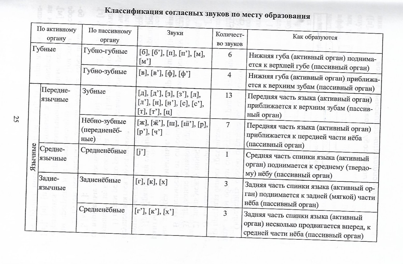 4. Systém souhlásek ruského jazyka. Klasifikace dle místa a způsobu vzniku. Zvláštnosti v porovnání se systémem souhlásek v českém jazyce.